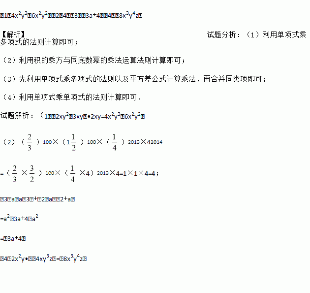 (1)4x2y3﹣6x2y2;(2)4;(3)﹣3a+4;(4)﹣8x3y4z. 【解析】试题分析:(1)利用单项式乘多项式的法则计算即可; (2)利用积的乘方与同底数幂的乘法运算法则计算即可; (3)先利用单项式乘多项式的法则以及平方差公式计算乘法,再合并同类项即可; (4)利用单项式乘单项式的法则计算即可. 试题解析:(1)(2xy2﹣3xy)•2xy=4x2y3...