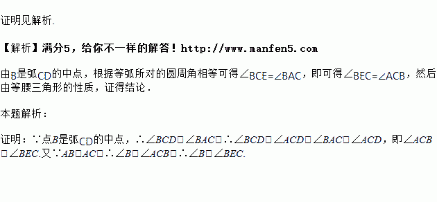 如图所示,△ABC内接于⊙O,AB=AC,D在上,连接CD交AB于点E,B是的中点,求证:∠B=∠BEC.
