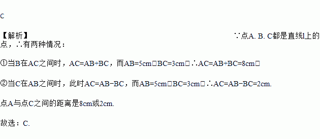 C 【解析】∵点A. B. C都是直线l上的点,∴有两种情况: ①当B在AC之间时,AC=AB+BC,而AB=5cm,BC=3cm,∴AC=AB+BC=8cm; ②当C在AB之间时,此时AC=AB?BC,而AB=5cm,BC=3cm,∴AC=AB?BC=2cm. 点A与点C之间的距离是8cm或2cm. 故选:C.