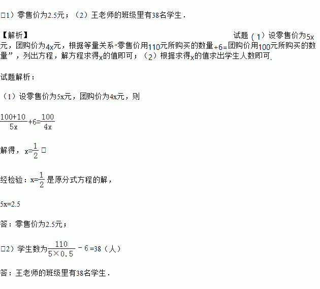 元旦晚会上,王老师要为她的学生及班级的六位科任老师送上贺年卡,网上购买贺年卡的优惠条件是:购买50或50张以上享受团购价.王老师发现:零售价与团购价的比是5:4,王老师计算了一下,按计划购买贺年卡只能享受零售价,如果比原计划多购买6张贺年卡就能享受团购价,这样她正好花了100元,而且比原计划还节约10元钱;