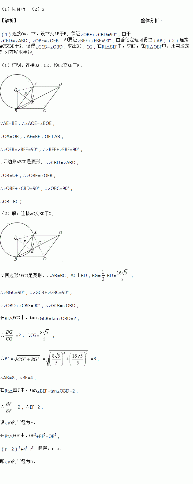 (2)若BD=,tan∠OBD=2,求⊙O的半径.