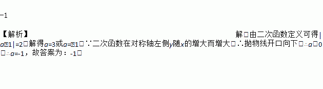 -1 【解析】解:由二次函数定义可得|a﹣1|=2,解得a=3或a=﹣1,∵二次函数在对称轴左侧y随x的增大而增大,∴抛物线开口向下,∴a<0,∴a=-1,故答案为:-1.