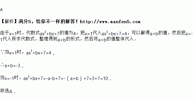 若x=1时,ax3+bx+7式子的值为4,则当x=﹣1时,式子ax3+bx+7的值为( )