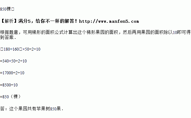 一个苹果园的形状是梯形,它的下底是180m,上底是160m,高是50m,如果每棵苹果树占地10m2,这个果园共有苹果树多少棵?