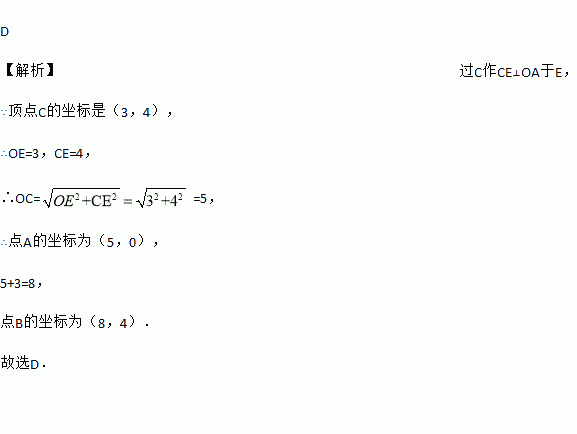 如图,在平面直角坐标系中,菱形OABC的顶点C的坐标是(3,4),则顶点A、B的坐标分别是( )
