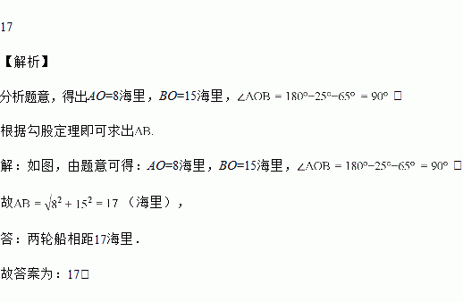 (如图,轮船甲从港口O出发沿北偏西25°的方向航行8海里,同时轮船乙从港口O出发沿南偏西65°的方向航行15海里,这时两轮船相距_____海里.