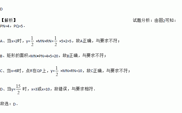 如图1,在矩形MNPQ中,动点R从点N出发,沿着N→P→Q→M方向运动至点M处停止,设点R运动的路程为x,△MNR的面积为y,如果y关于x的函数图象如图2所示,则下列说法不正确的是( )