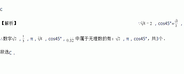 数字,,π,,cos45°,中是无理数的个数有( )个.