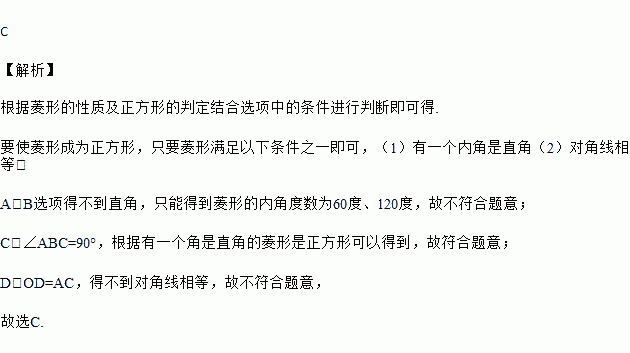 如图,在菱形ABCD中,对角线AC、BD交于点O,添加下列一个条件,能使菱形ABCD成为正方形的是( )
