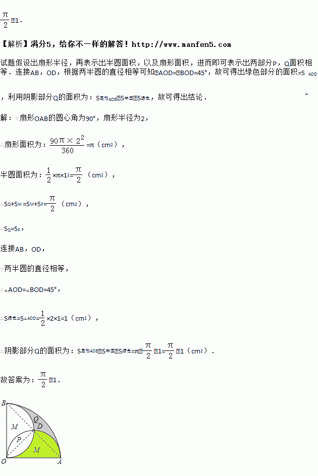 如图,在半径为2cm,圆心角为90°的扇形OAB中,分别以OA、OB为直径作半圆,则图中阴影部分的面积为_____.