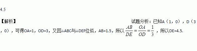 如图,在平面直角坐标系中,已知A(1,0),D(3,0),△ABC与△DEF位似,原点O是位似中心.若AB=1.5,则DE= .