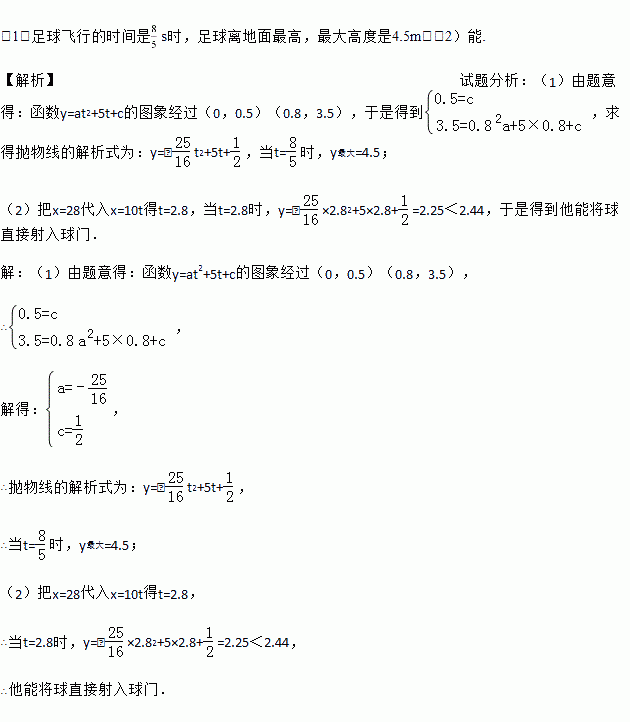 (2)若足球飞行的水平距离x(单位:m)与飞行时间t(单位:s)之间具有函数关系x=10t,已知球门的高度为2.44m,如果该运动员正对球门射门时,离球门的水平距离为28m,他能否将球直接射入球门?