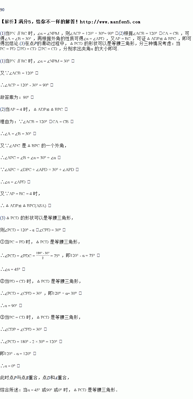 在△ABC中,CA=CB=4,∠ACB=120°,将一块足够大的直角三角尺PMN(∠M=90°、∠MPN=30°)按如图所示放置,顶点P在线段AB上滑动,三角尺的直角边PM始终经过点C,并且与CB的夹角∠PCB=α,斜边PN交AC于点D.