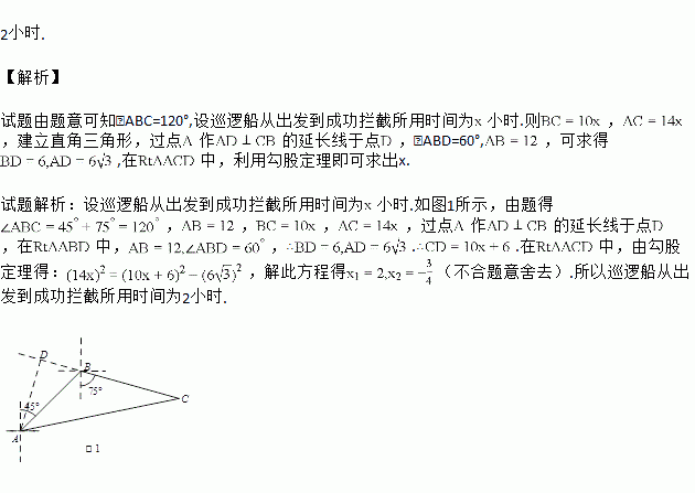 如图,禁止捕鱼期间,某海上稽查队在某海域巡逻,上午某一时刻在A处接到指挥部通知,在他们东北方向距离12海里的B处有一艘捕鱼船,正在沿南偏东75°方向以每小时10海里的速度航行,稽查队员立即乘坐巡逻船以每小时14海里的速度沿北偏东某一方向出发,在C处成功拦截捕鱼船,求巡逻船从出发到成功拦截捕鱼船所用的时间.
