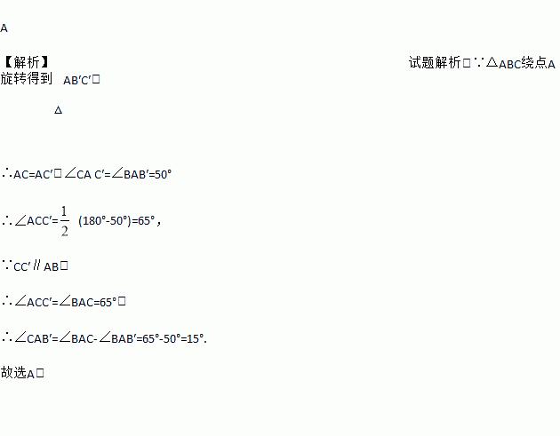 A 【解析】试题解析:∵△ABC绕点A旋转得到△AB′C′, ∴AC=AC′,∠CA C′=∠BAB′=50° ∴∠ACC′= (180°-50°)=65°, ∵CC′∥AB, ∴∠ACC′=∠BAC=65°. ∴∠CAB′=∠BAC-∠BAB′=65°-50°=15°. 故选A.