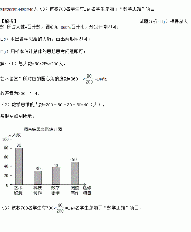 (1)200,144(2)40人(3)该校700名学生有140名学生参加了“数学思维”项目 【解析】试题分析: (1)根据总人数=所占人数÷百分数,圆心角=360°×百分比,分别计算即可; (2)求出数学思维的人数,画出条形图即可; (3)用样本估计总体的思想思考问题即可; 解:(1)总人数=50÷25%=200人, 艺术鉴赏”所对应的圆心角的度数=360°×=144...