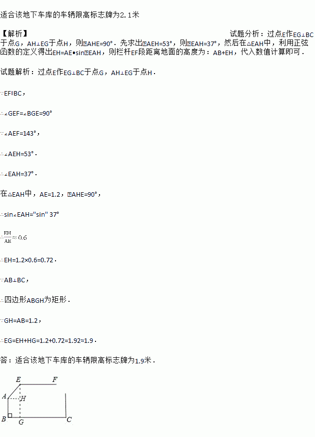 某地下车库出口处安装了“两段式栏杆”,如图1所示,点A是栏杆转动的支点,点E是栏杆两段的联结点.当车辆经过时,栏杆AEF最多只能升起到如图2所示的位置,其示意图如图3所示(栏杆宽度忽略不计),其中AB⊥BC, EF∥BC,∠AEF=143°,AB=AE=1.3米,那么适合该地下车库的车辆限高标志牌为多少米?(结果精确到0.1.参考数据:sin 37° ≈ 0.60,cos 37° ≈ 0.80,tan 37° ≈ 0.75)