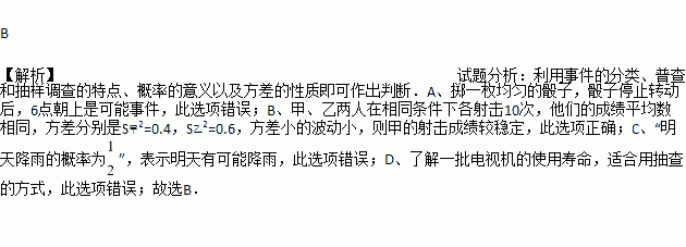 B. 甲、乙两人在相同条件下各射击10次,他们的成绩平均数相同,方差分别是S甲2=0.4,S乙2=0.6,则甲的射击成绩较稳定