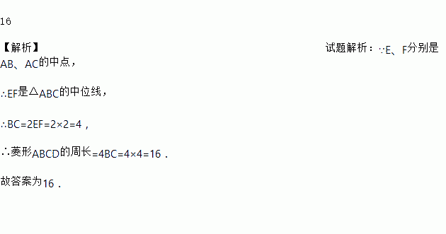 如图,菱形ABCD中,E,F分别是AB,AC的中点,若EF=2,则菱形ABCD的周长是_______.