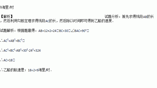 甲、乙两船同时从港口A出发,甲船以12海里/时的速度向 北偏东35°航行,乙船向南偏东55°航行,2小时后,甲船到达C岛,乙船到达B岛,若C、B两船相距30海里,问乙船的速度是每小时多少海里?
