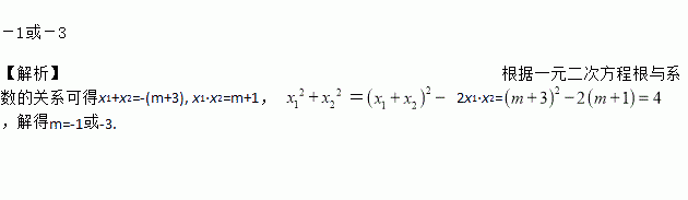 已知关于x的一元二次方程x2+(m+3)x+m+1=0的两个实数根为x1,x2,若=4,则m的值为___________.