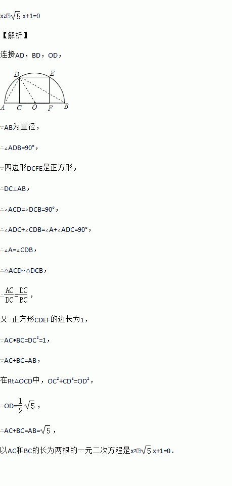 如图,在以AB为直径的半圆中,有一个边长为1的内接正方形CDEF,则以AC和BC的长为两根的一元二次方程是________.
