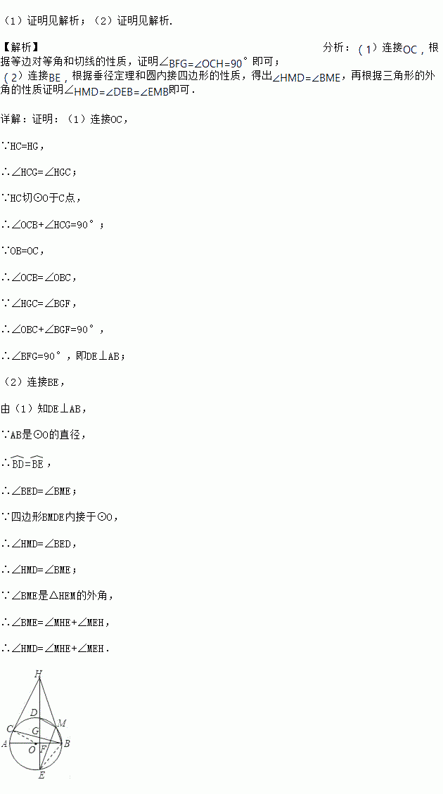 上一点,弦DE交⊙O于点E,交AB于点F,交BC于点G,过点C的切线交ED的延长线于H,且HC=HG,连接BH,交⊙O于点M,连接MD,ME.