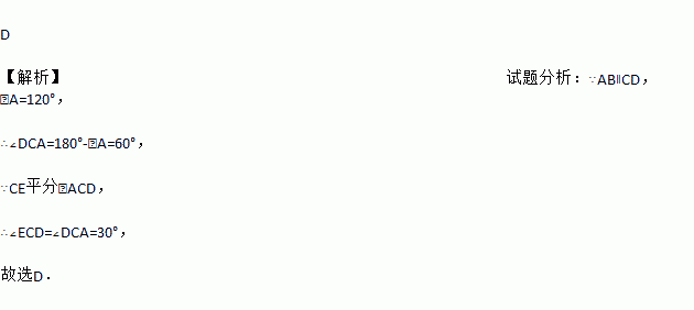 如图所示,已知AB∥CD,CE平分∠ACD,当∠A=120°时,∠ECD的度数是( )