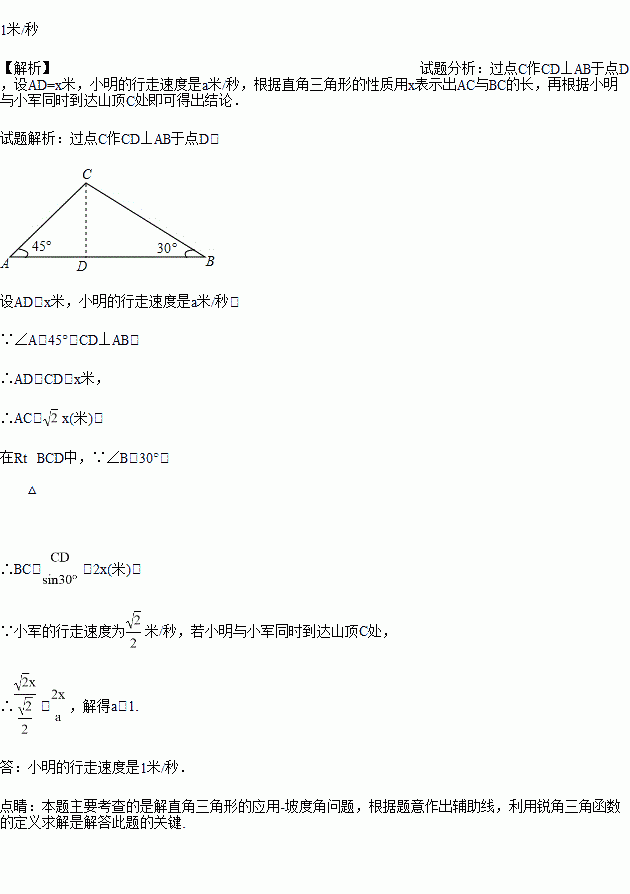 如图,天星山山脚下西端A处与东端B处相距800(1+)米,小军和小明同时分别从A处和B处向山顶C匀速行走.已知山的西端的坡角是45°,东端的坡角是30°,小军的行走速度为米/秒.若小明与小军同时到达山顶C处,则小明的行走速度是多少?