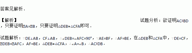 Èçͼ£¬DE¡ÍAB£¬CF¡ÍAB£¬´¹×ã·Ö±ðÊǵãE¡¢F£¬DE=CF£¬AE=BF£¬ÇóÖ¤£ºAC¡ÎBD£®