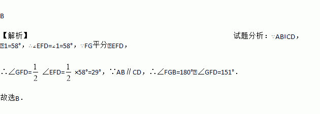 如图,AB∥CD,∠1=58°,FG平分∠EFD,则∠FGB的度数等于( )