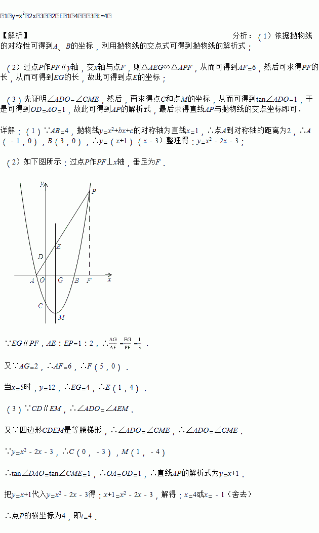(3)记抛物线的顶点为M,与y轴的交点为C,当四边形CDEM是等腰梯形时,求t的值.