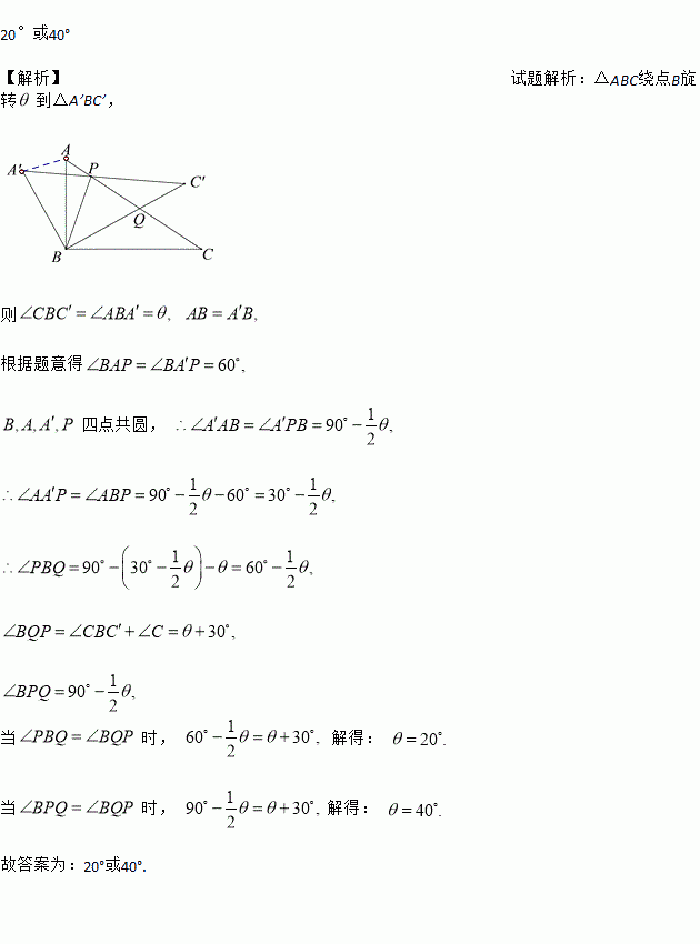 如图,在Rt△ABC中,∠C=30°,将△ABC绕点B旋转 (0< <60°)到△A’BC’,边AC和边A’C’相交于点P,边AC和边BC’相交于Q,当△BPQ为等腰三角形时,则=