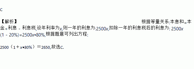 C 【解析】根据等量关系:本息和=本金+利息-利息税,设年利率为x,则一年的利息为:2500x,扣除一年的利息税后的利息为: 2500x(1-20%)=2500x•80%,根据题意可列出方程: 2500(1+x•80%)=2650,故选C.