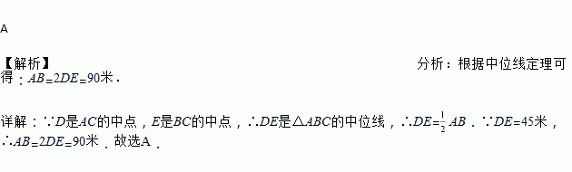 如图,要测量被池塘隔开的A,B两点的距离,小明在AB外选一点C,连接AC,BC,并分别找出它们的中点D,E,并分别找出它们的中点D,E,连接DE,现测得DE=45米,那么AB等于( )