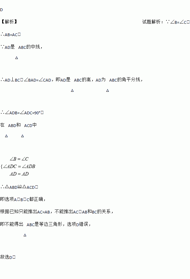 A. △ABD≌△ACD B. AD为△ABC的高线 C. AD为△ABC的角平分线 D. △ABC是等边三角形