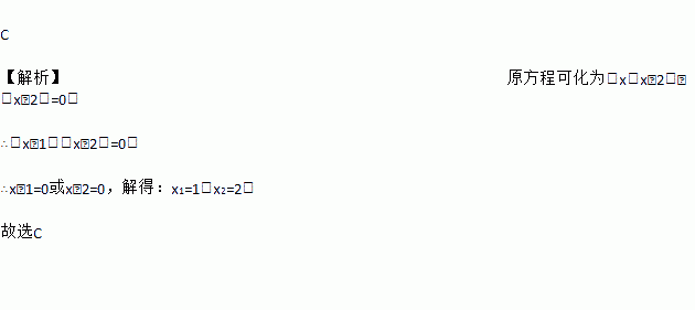 C 【解析】原方程可化为:x(x﹣2)﹣(x﹣2)=0, ∴(x﹣1)(x﹣2)=0, ∴x﹣1=0或x﹣2=0,解得:x1=1,x2=2. 故选C