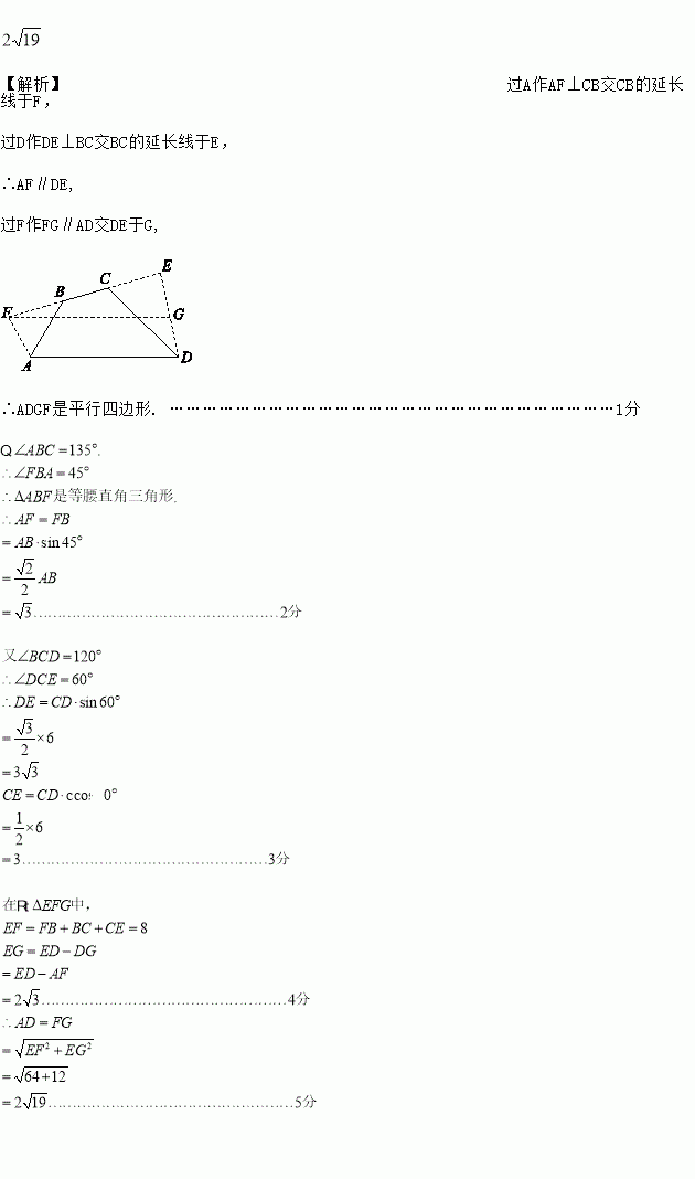 已知:如图,四边形ABCD中,∠ABC=135°,∠BCD=120°,AB=,BC=,CD=6,求AD的长.