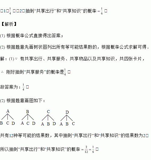 £¬ÔÙ´ÓÖÐËæ»ú³éȡһÕÅÇëÓÃÁбí»ò»Ê÷×´ ͼµÄ·½·¨Çó³éµ½µÄÁ½ÕÅ¿¨Æ¬Ç¡ºÃÊÇ¡°¹²Ïí³öÐС±ºÍ¡°¹²Ïí֪ʶ¡±µÄ¸ÅÂÊ![]()