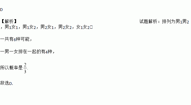 有两名男生和两名女生,王老师要随机地,两两一对地为他们排座位,一男一女排在一起的概率为( )