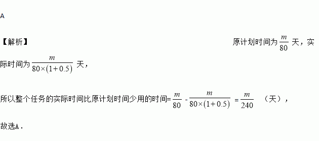 某县正在开展“拆临拆违”工作,某街道产生了m立方米的“拆临拆违”垃圾需要清理,一个工程队承包了清理工作,计划每天清理80立方米,考虑到还有其它地方的垃圾需要清理,该工程队决定增加人手以提高50%的清理效率,则完成整个任务的实际时间比原计划时间少用了( )