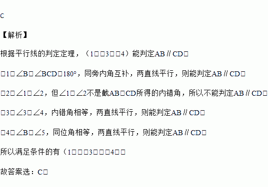 如图,下列条件中: (1)∠B+∠BCD=180°;(2)∠1=∠2;(3)∠3=∠4;(4)∠B=∠5.能判定AB∥CD的条件个数有( )
