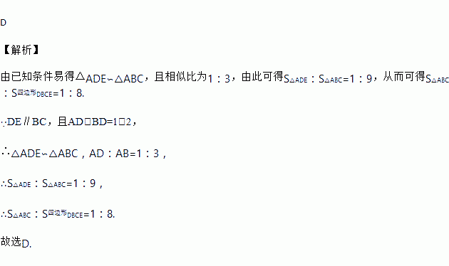 如图在△ABC中,DE∥BC,且AD:BD=1:2,则S△ADE:S四边形DBCE=( )