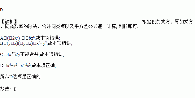 A. (-2x2)3=-6x6 B. (y+x)(-y+x)=y2-x2 C. 4x+2y=6xy D. x4÷x2=x2