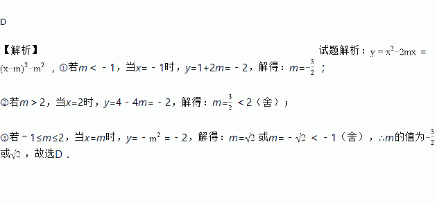 已知二次函数y=x2﹣2mx(m为常数),当﹣1≤x≤2时,函数值y的最小值为﹣2,则m的值是( )