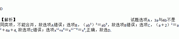A. 3a+4b=7ab B. (ab3)2=ab6 C. (a+2)2=a2+4 D. x12÷x6=x6