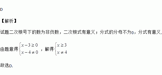 A. x>3 B. x≥3 C. x>4 D. x≥3且x≠4