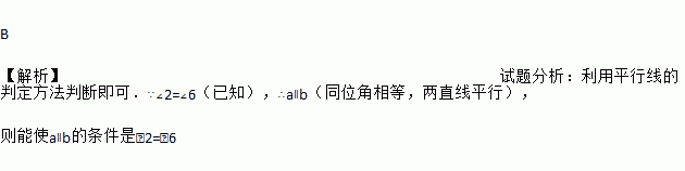 B 【解析】试题分析:利用平行线的判定方法判断即可.∵∠2=∠6(已知),∴a∥b(同位角相等,两直线平行), 则能使a∥b的条件是∠2=∠6