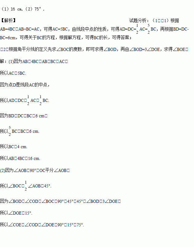 (1)如图1,已知点D是线段AC的中点,点B在线段DC上,且AB=4BC,若BD=6 cm,求AB的长;