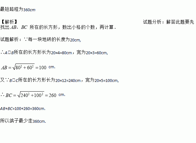 如图,是一块由边长为20cm的正方形地砖铺设的广场,一只鸽子落在点A处,它想先后吃到小朋友撒在B、C处的鸟食,则鸽子至少需要走多远的路程?